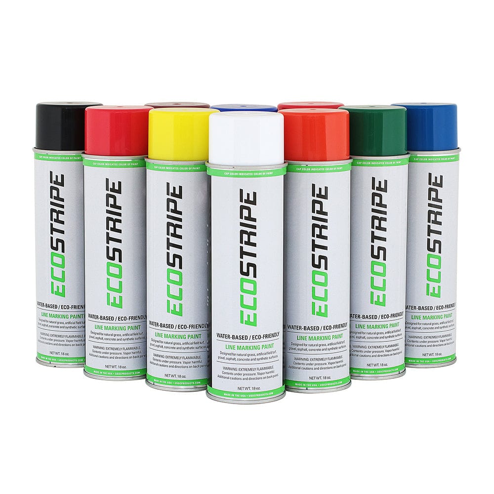 Formulated and manufactured by USSC, this eco-friendly proprietary water-based formula is available in white and 15 vibrant colors. ECO STRIPE marking paint is easy to spray, environmentally safe, non-clogging, and will not hurt, turn brown, or kill any type of natural grass. Aerosol cans will spray sharp, bright lines that will maintain good visibility. ECO STRIPE performance and quality are above any other water-based marking paint in its category. If a more durable paint is needed, we offer our DuraStripe formulation. Our universal ” T ” tip fits most aerosol can line marking machines and will spray a 2 to 4 inch wide adjustable line. ECO STRIPE is also available in a narrow spray pattern, cylindrical ” UMA ” tips.