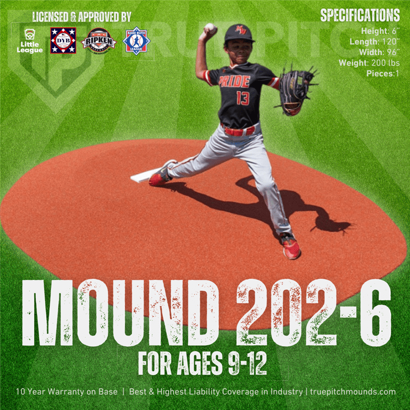 The True Pitch Mound 202-6 is made of reinforced fiberglass and covered with AstroTurf. The 202-6 is approved for Official Bronco League games. The 202-6 meets Pony League and Dixie Youth Baseball specifications. Dimensions: 6″ Height, 8’1″ Wide, 10’1″ Long, 200 lbs.