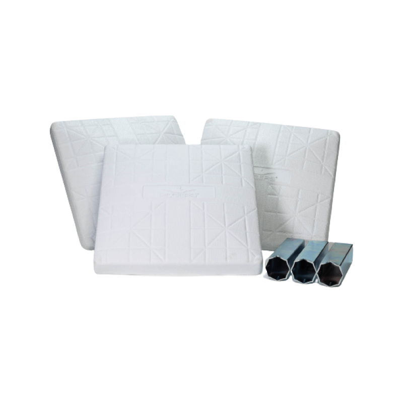 Durable and long-lasting, Rogers Pro-Style base set is an excellent alternative to the Jack Corbett MLB base. Pebble-embossed, UV-resistant molded white rubber with heavy-duty PU foam pad. Triple-reinforced welded steel anchor system and stanchion pan are powder-coated and rust-resistant. Reinforced side walls withstand extreme use. Ground anchors and base plugs are included.