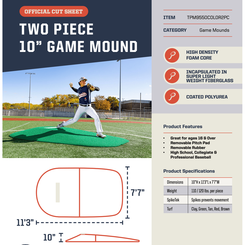 High School Competition's Premier Choice - Now More Portable - The two-piece version of our 10” Portolite Mound elevates its convenience, offering unparalleled portability alongside competitive excellence. Ideal for high school athletes and above, this mound is not only lightweight but also easily transportable, perfect for teams on the move. It retains the exceptional quality of the standard model, including the high-performance poly core, fiberglass reinforcement, and premium AstroTurf®, all while providing the authentic feel of a regulation mound.