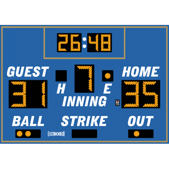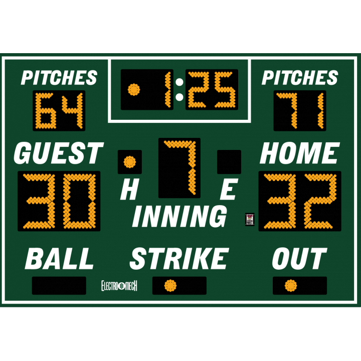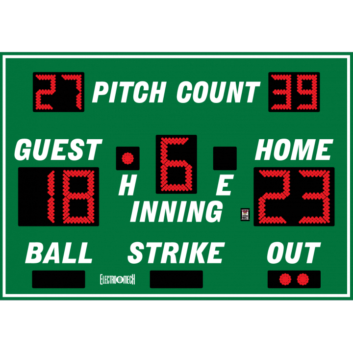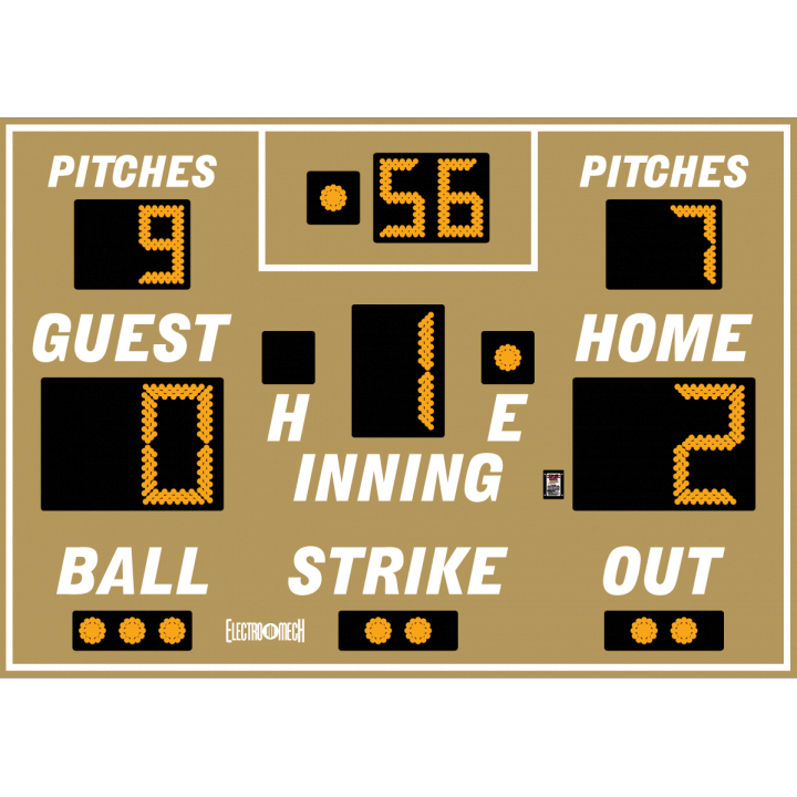 Model LX1160 is the flagship of the series and the first standard Electro-Mech scoreboard model to offer Pitch Counts. This is our "Double Pitch Count" style -- with digits for both the Home and Guest Teams always visible. Our LX16xx and LX17xx series scoreboard include models with a "Single Pitch Count" feature -- meaning the Pitch Count digits alternate between showing Home and Guest Pitch Counts depending on which team is at bat. In either case, the control console keeps track of the totals throughout the game.