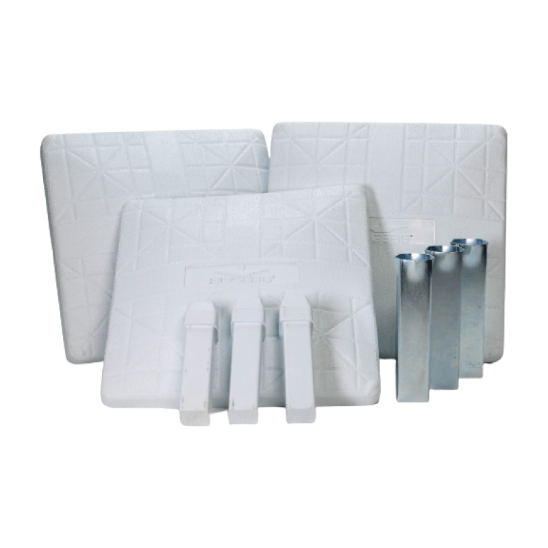Rogers Pro-Style Flexy-Base is constructed of 100% durable white rubber. Underside beehive design allows the base to compress upon impact reducing sliding injuries while providing stability and support during regular play. Pebble-embossed, UV-resistant base top helps to prevent slipping and spike puncture. Ground anchors, rubber stanchions, and base plugs are included.
