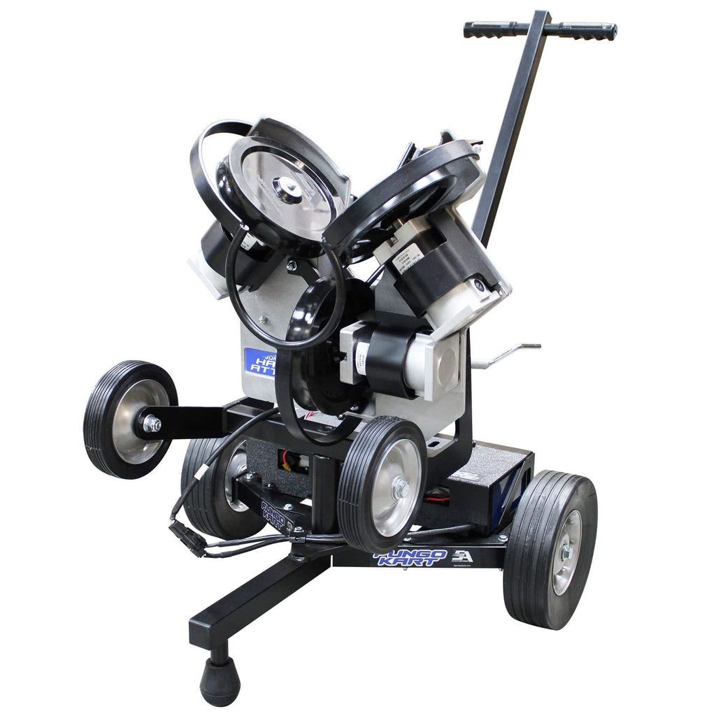 The New Junior Fungo Kart Combo will take your fungo drills to a new level. The combo incudes our reliable workhorse, the Junior Hack Attack combined with the new lightweight Fungo Kart. The swivel design on the Junior allows 360 degrees of movement to easily simulate fly balls, grounders and catcher pop-ups. This extremely portable yet durable steel Fungo Kart quickly maneuvers around the infield using solid, heavy-duty transport wheels.